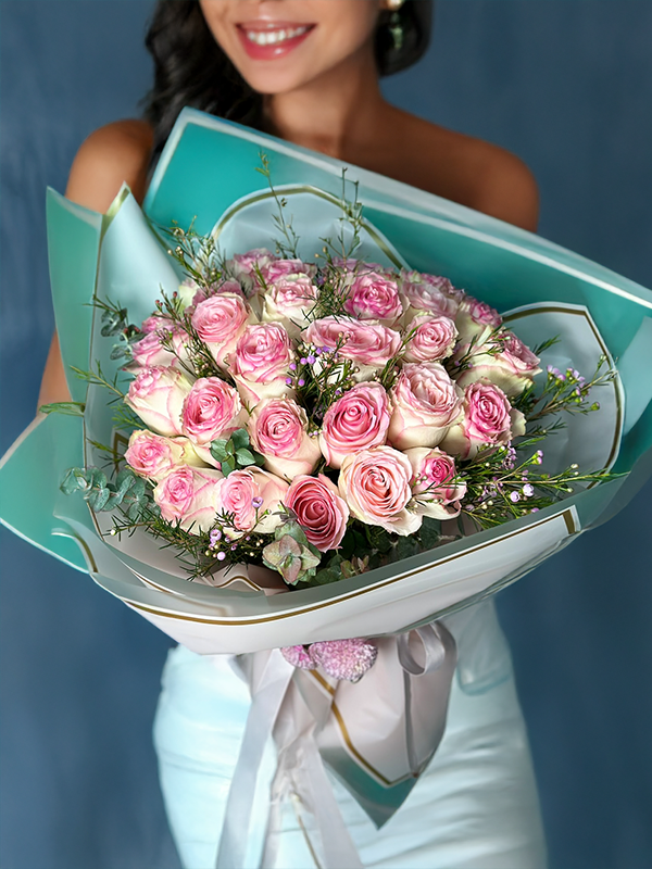 Pembe Gül buketi ithal büyük kafa güller ile hazırlanır içerisinde min 25-30 güllerden oluşur canlı çiçekler mevsimsel olarak farklılık gösterebilir tasarım bütünlüğü bozulmaz.